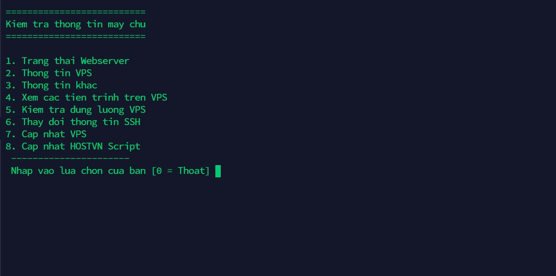 Để sử dụng chức năng này, từ MENU chính bạn số (10), khi đó màn hình chức năng Quản lý VPS sẽ hiện ra.
